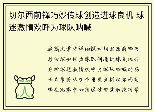 这篇文章将详细探讨切尔西前锋巧妙传球如何为球队创造进球良机,并分析球迷激情欢呼为球队呐喊的场面。文章将从多个角度分析切尔西前锋在比赛中如何通过智慧和技巧带动进攻,并为队友创造机会。此外,文章还将关注球迷在比赛中的情感表现,探讨他们如何通过欢呼声和呐喊为球队加油助威。全文分为四个部分,每个部分都有具体...