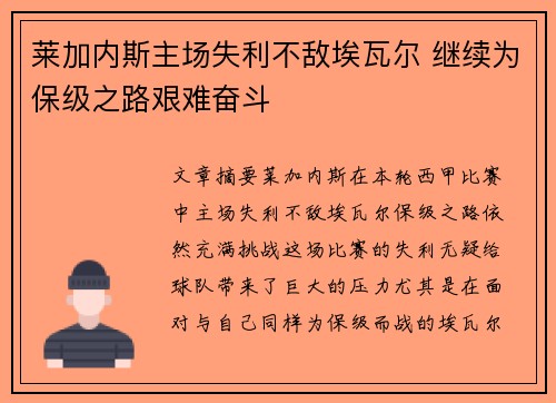 文章摘要:莱加内斯在本轮西甲比赛中主场失利不敌埃瓦尔,保级之路依然充满挑战。这场比赛的失利无疑给球队带来了巨大的压力,尤其是在面对与自己同样为保级而战的埃瓦尔时,失去宝贵的主场分数无疑加剧了球队的困境。莱加内斯本赛季一直在为保级努力,但他们在攻防两端存在不少问题,比赛中的失误和不稳定的表现使得他们的保级形势愈发艰难。本篇文章将从球队表现、战术分析、心理状态和接下来比赛的展望四个方面,详细探讨莱加内斯如何在面对失利后继续为保级而奋斗,并分析他们未来的挑战与机会。