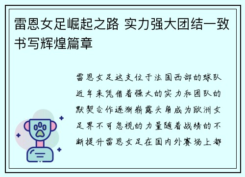雷恩女足崛起之路 实力强大团结一致书写辉煌篇章