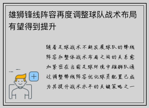随着足球战术不断发展,球队的锋线阵容和整体战术布局之间的关系愈加紧密。在当前足球环境中,雄狮队通过调整锋线阵容,优化球员配置,已成为其提升战术水平的关键策略之一。本文将从四个方面详细探讨雄狮锋线阵容的调整如何促进球队战术布局的提升。这四个方面分别是:锋线配置的变化与战术转型、球员个性化特点的结合、锋...