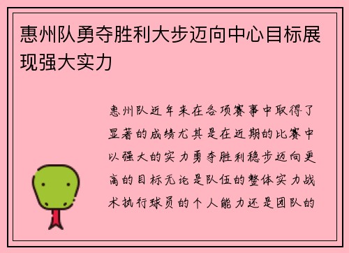 惠州队近年来在各项赛事中取得了显著的成绩,尤其是在近期的比赛中,以强大的实力勇夺胜利,稳步迈向更高的目标。无论是队伍的整体实力、战术执行、球员的个人能力,还是团队的协作精神,惠州队都展现出了令人惊叹的表现。本文将从四个方面详细分析惠州队如何勇夺胜利,向着他们的中心目标迈进,并通过这一过程展现出强大的...