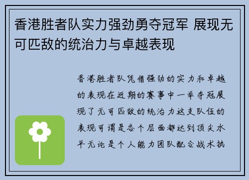 香港胜者队实力强劲勇夺冠军 展现无可匹敌的统治力与卓越表现